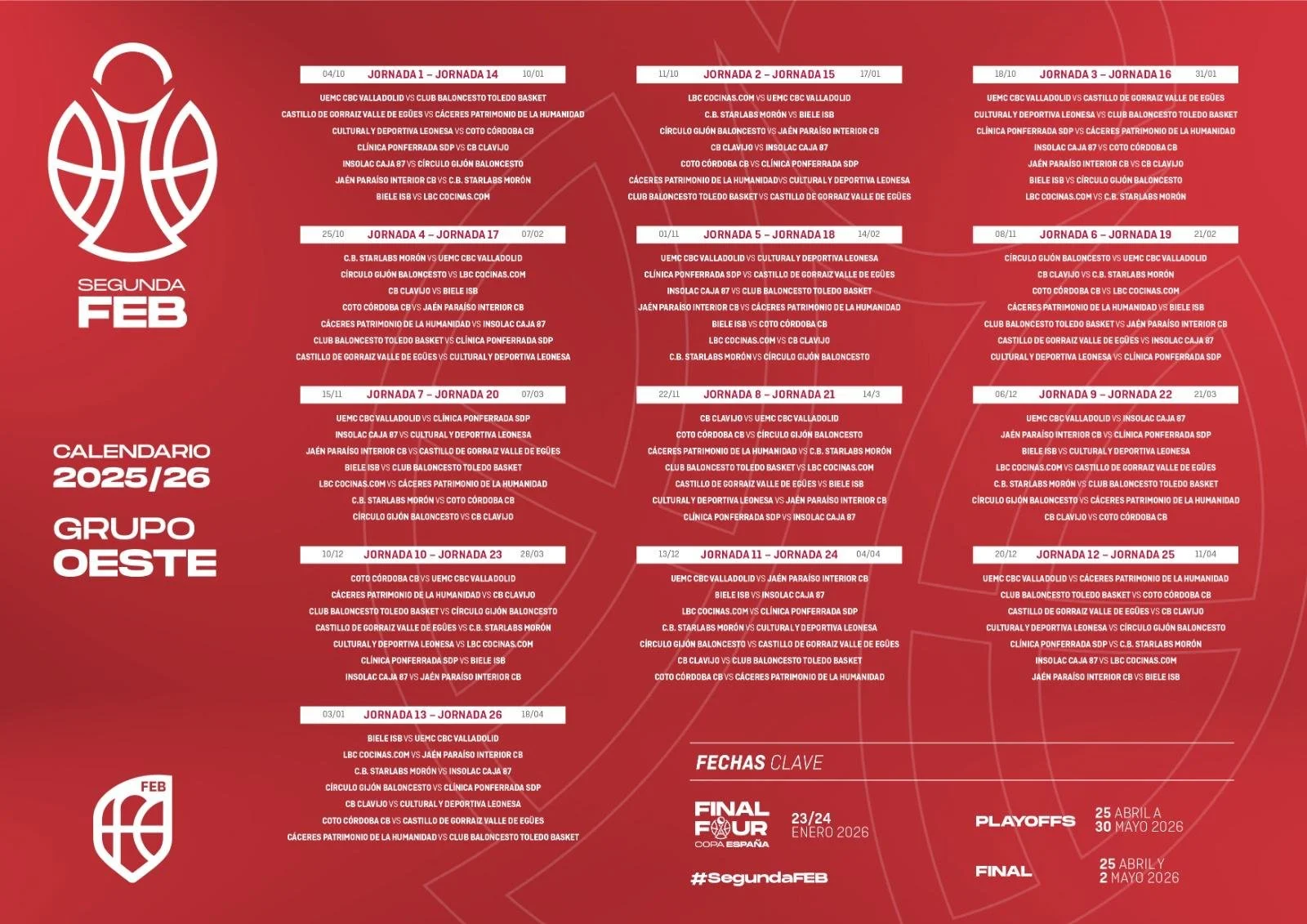 La FEB prevé como fechas destacadas que la Final Four de la Copa de España se celebre los días 23 y 24 de enero de 2026; los playoffs, del 25 de abril al 30 de mayo; y la final del 25 de abril al 2 de mayo.