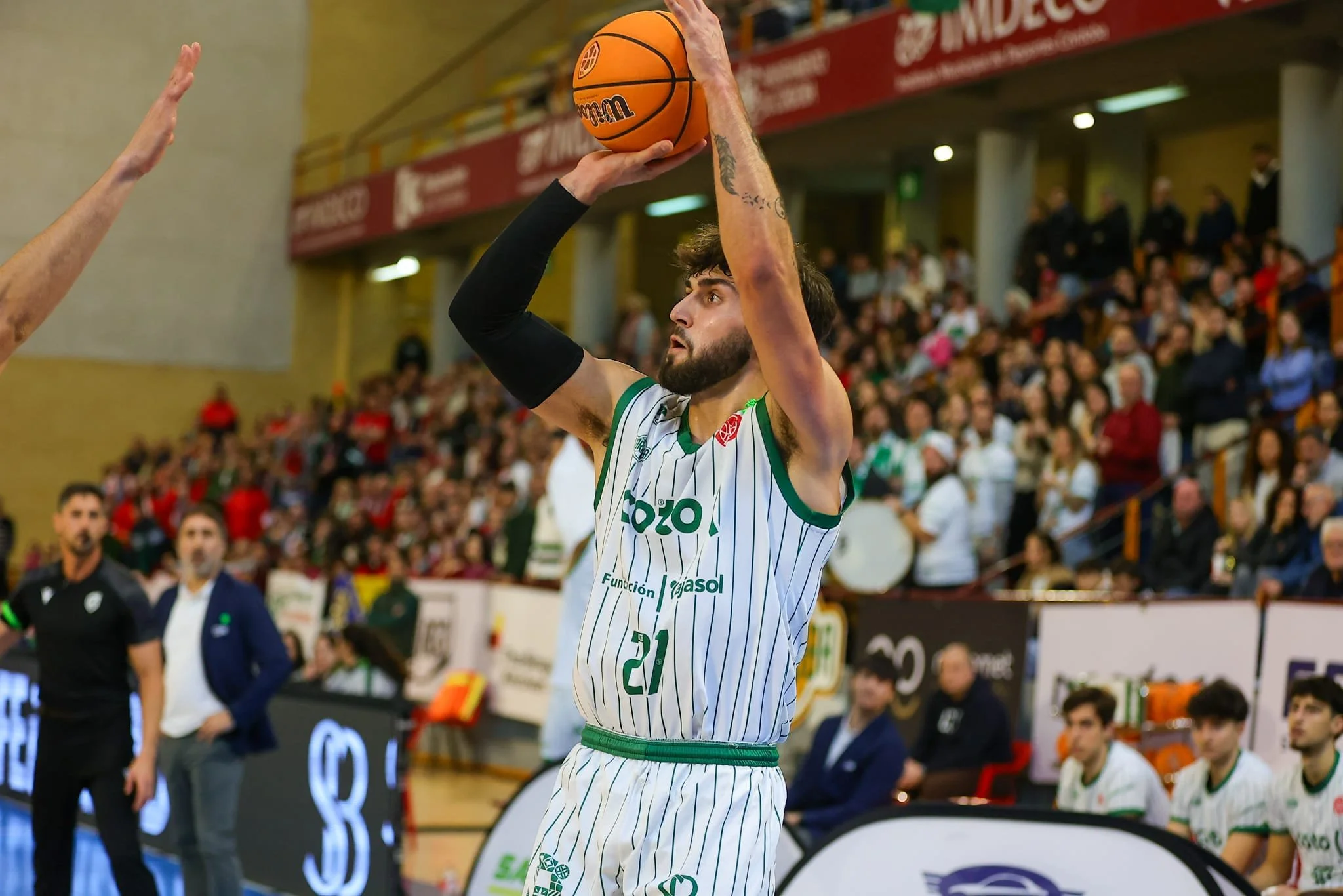 Jankovic abrió el marcador en el un primer cuarto que se fue fraguando con un intenso nivel de juego, en ataque y defensa por parte de sendos conjuntos y con una presión desde la grada digna de mención. Schutte abrió para los blanquiverdes antes de que Gonzalo Orozco avanzara en el casillero con un triplazo sobre la bocina. Una desconexión defensiva propició la réplica en el ataque de los sevillanos que revalidaron con un triple Cecilia, situando por delante a su equipo.