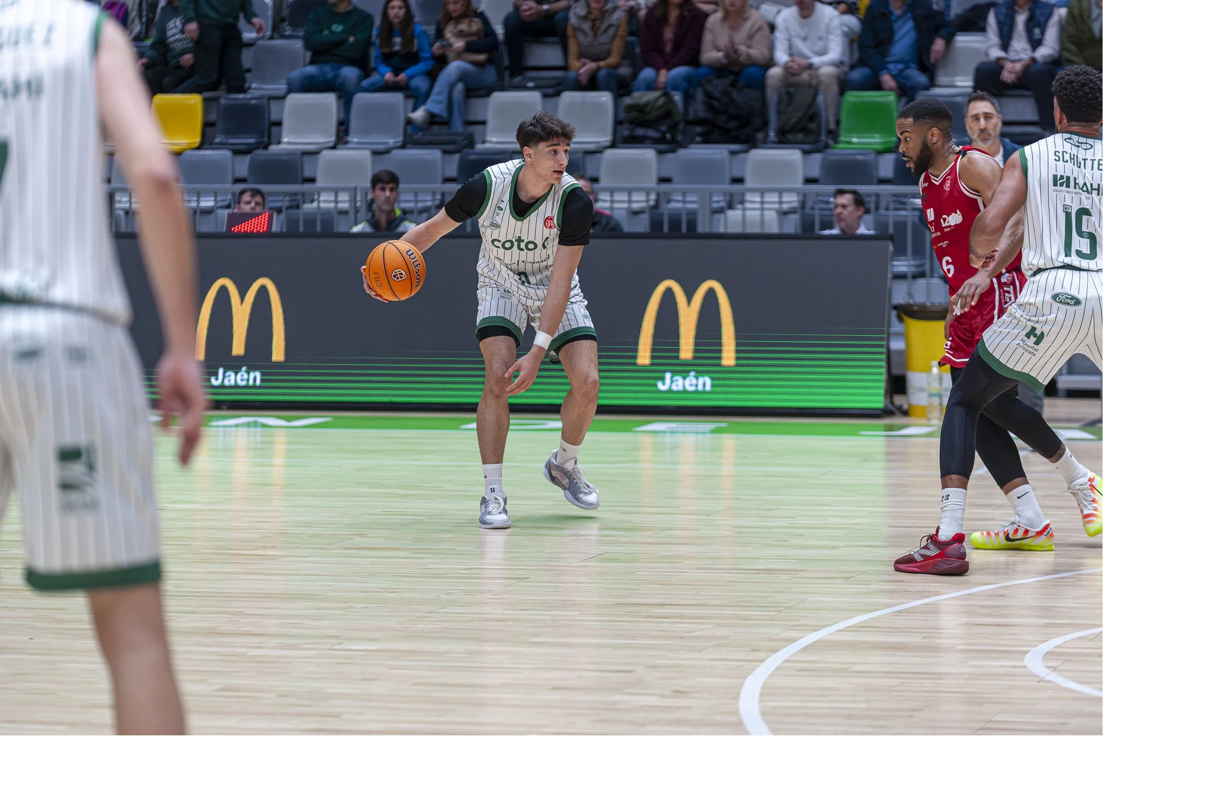 Los hombres de Gonzalo Rodríguez Palmeir empezaron a sufrir, reduciendo porcentajes y con dificultad para llegar a tiros liberados con la misma facilidad. Aun así, Schutte sostenía a los suyos con puntos importantes (40-44), evitando que el vuelco en el marcador se consumara antes de tiempo. El tramo final fue un intercambio de golpes. Jaén, lanzado, llegó a colocarse a solo dos puntos tras una canasta de Boahen (42-44) a falta de segundos, culminando un parcial que cambió por completo la dinámica del encuentro. El segundo cuarto se cerró con un 23-15 a favor de los locales.