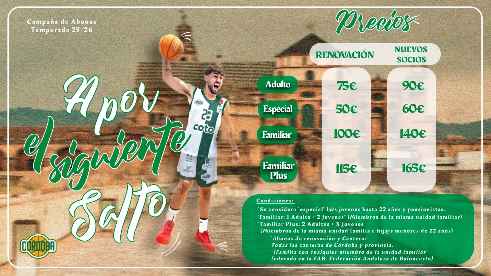 El abono, que podrá adquirirse a partir de mañana a mediodía en la dirección web https://cordobacb.es/abonos , fija como principal novedad un descuento para nuevos socios que posean ficha federativa en la Real Federación Andaluza de Baloncesto y personas con vínculo familiar acreditado.